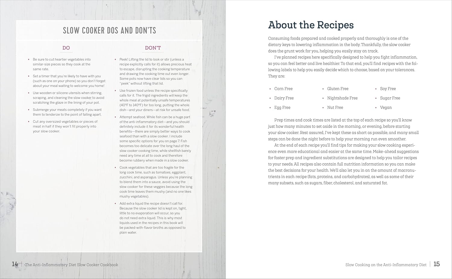 Discover basic principles of the diet, with a special focus on foods for fighting inflammation and foods that cause flare-ups. Explore slow-cooking tips, including advice for choosing and getting to know your slow cooker, along with handy dos and don'ts. With this anti-inflammatory cookbook, you can prep and go―and dig in to nourishing, ready-to-eat meals when you get home.